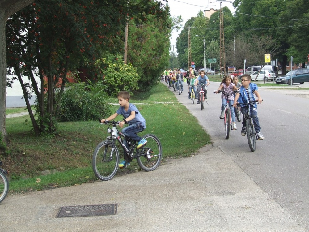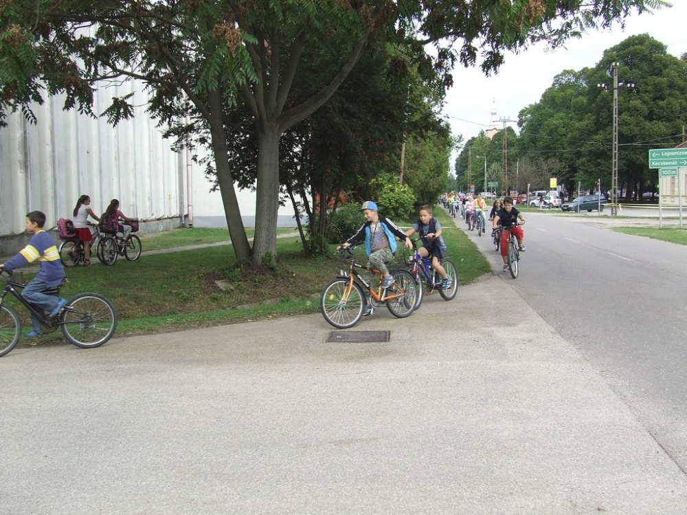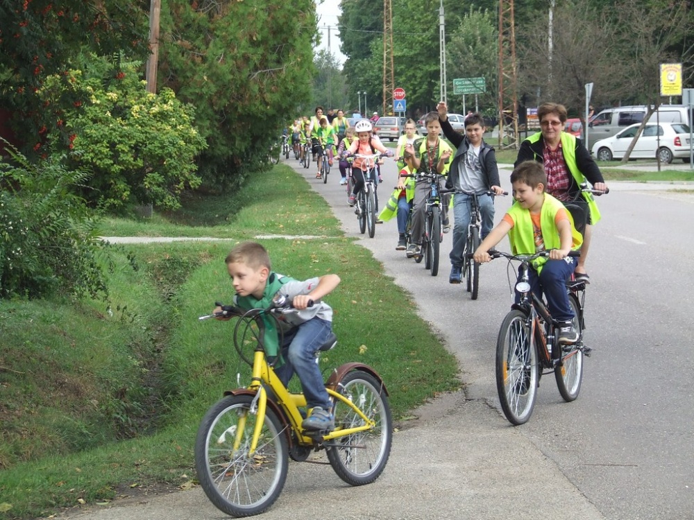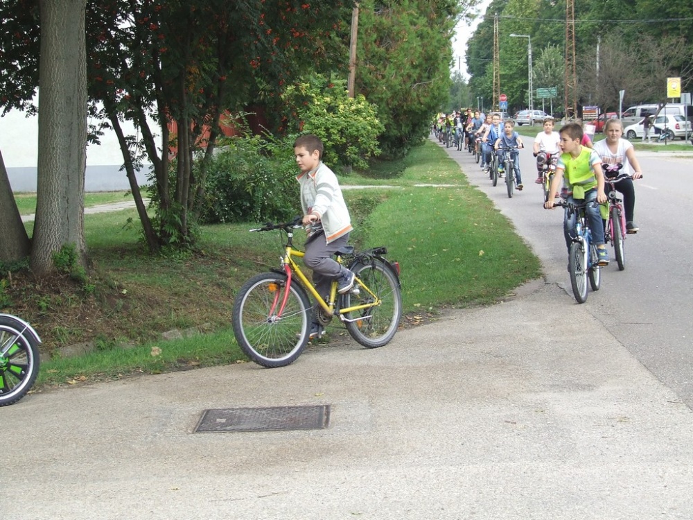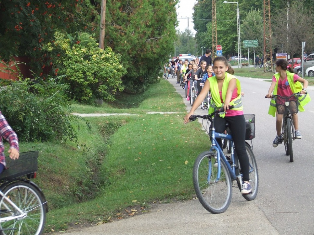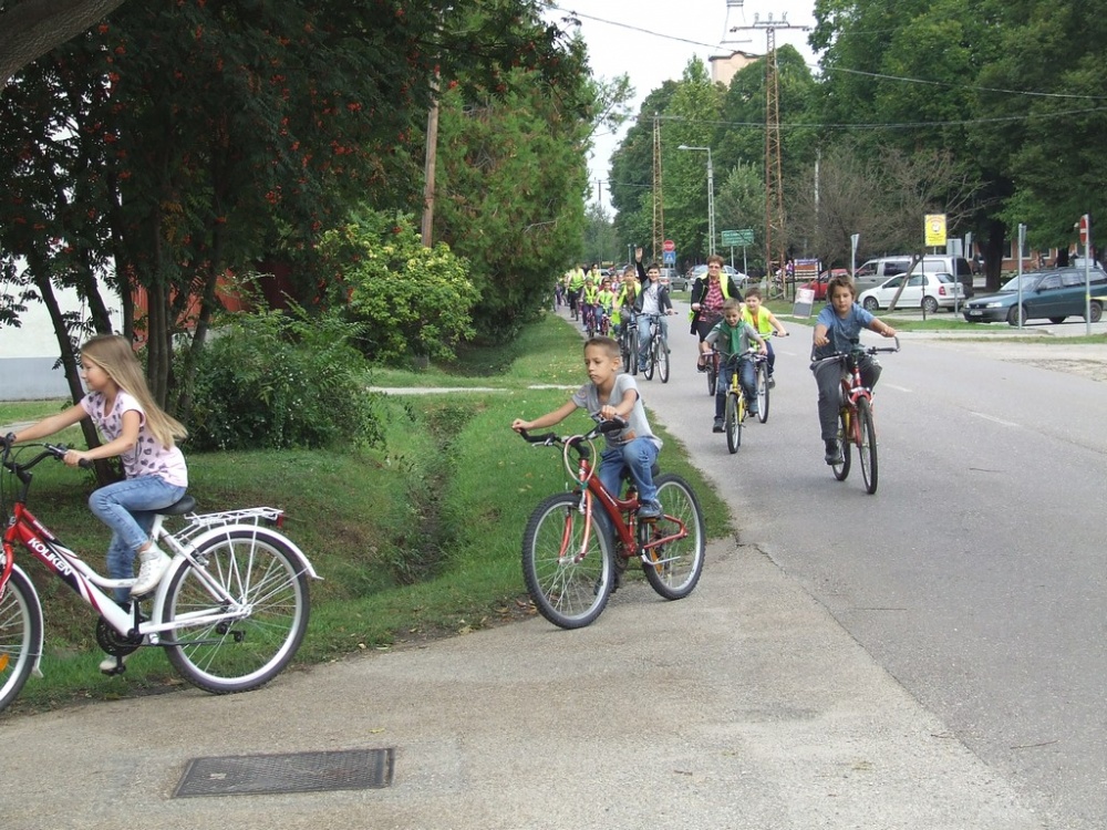 Az Európai Mobilitási Hét rendezvénysorozat keretében a Móra Ferenc Általános iskolában kerékpáros felvonulást tartottunk szeptember 20-án délután a város utcáin. 73 tanuló és 7 felnőtt kerekezett 5 km-t. A hosszú menetet a helyi Rendőrség és Polgárőrség képviselői kísérték, vigyáztak a biztonságos közlekedésre. A kellemes időben tett túra után totót töltöttek ki a résztvevők a helyes közlekedésről, környezetvédelemről. Amíg a totó kiértékelése zajlott, a gyerekeket pogácsa és gyümölcslé uzsonna várta az emeleti aulában. Az eredmény hirdetéskor sok értékes jutalom talált gazdára, pl. kerékpár felszerelési tartozékok, láthatósági mellények, környezetbarát zsebszámológépek, tollkészletek. Mindenkinek jutott az egészséges Müzli szeletből.