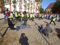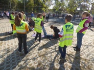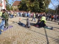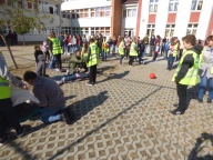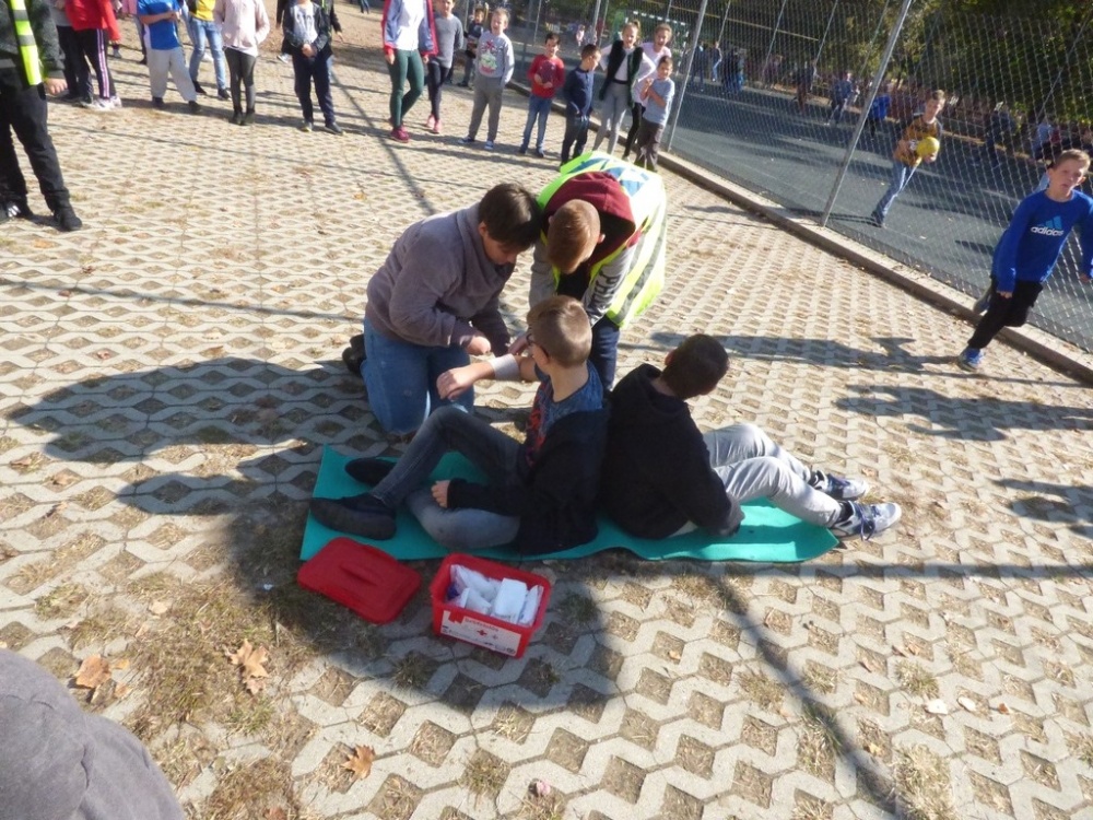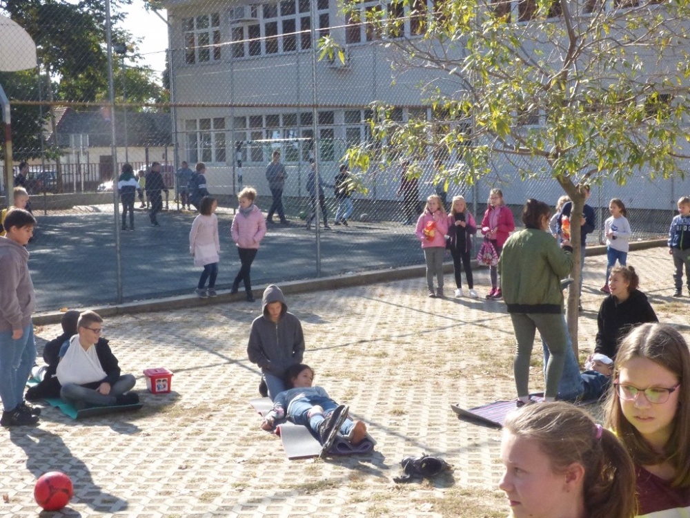 Nagyon készültünk a Katasztrófavédő szakkörösökkel az egészséghétre. Jött egy ötlet, hogy bátoríthatnánk az iskolatársainkat, hogy vegyék észre, ha valaki bajba jutott. Nem kell különösebb képzettség, hogy segítségére legyünk annak, akinek szüksége van rá. Amikor felvetettem a lehetőséget a számukra, azonnal beindult az ötletelés. Milyen történet legyen? Hány sebesült legyen? Ne legyen túl nehéz, mindenkinek legyen benne feladata. Ezekben pillanatok alatt egyetértettünk. Elég gyorsan kialakult, hogy ki melyik szerepben tudja elképzelni magát. Jó párszor elpróbáltuk kinek mit kell csinálnia, kinek milyen eszközre van szüksége. Nagyon örültem, hogy ilyen lelkesedéssel vetették be magukat a gyerekek. Kicsit nehezítette a felkészülést, hogy folyamatosan voltak hiányzóink a gyakorlás során. Legalább háromféle szereposztást csináltunk, mire valóban bemutattuk. A gyakorlat során az is kiderült, hogy egy szünetben az egyszerű egyhangfalas hangosítás kevés, de az udvar első felében játszó gyerekek számára nyilvánvalóvá vált, hogy most itt történik valami. Annál inkább, mert azzal zártuk a bemutatót, hogy a hátukon lévő betűkből összeolvasható volt a mottó: „Merj segíteni!”