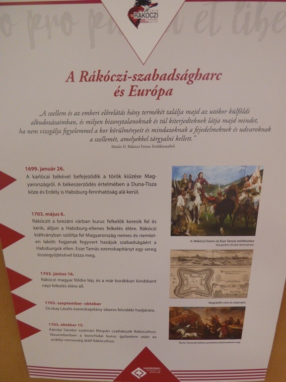 A kiállítás 9 tablón mintegy 50 képen, dokumentumon keresztül tekinti át a szabadságharc történetét, főbb eseményeit, II. Rákóczi Ferenc erdélyi fejedelem Magyarország vezérlő fejedelmének életét, kitekintéssel a korabeli magyarországi társadalmi viszonyokra.
