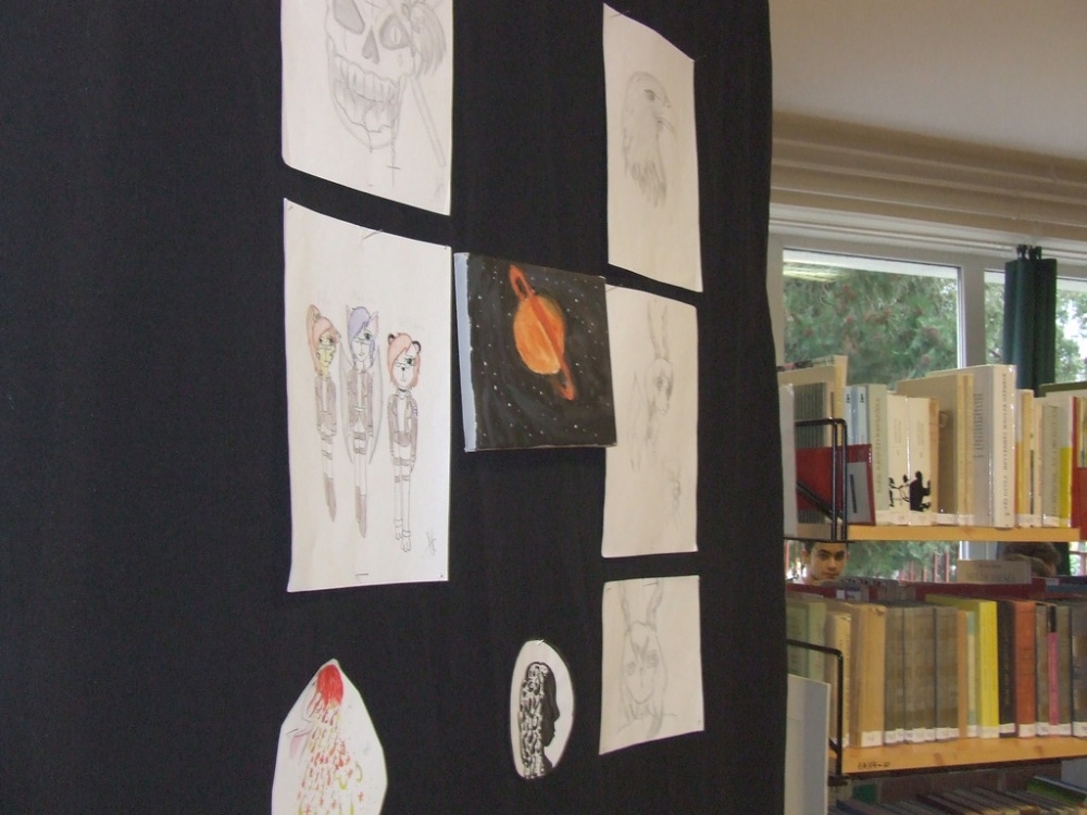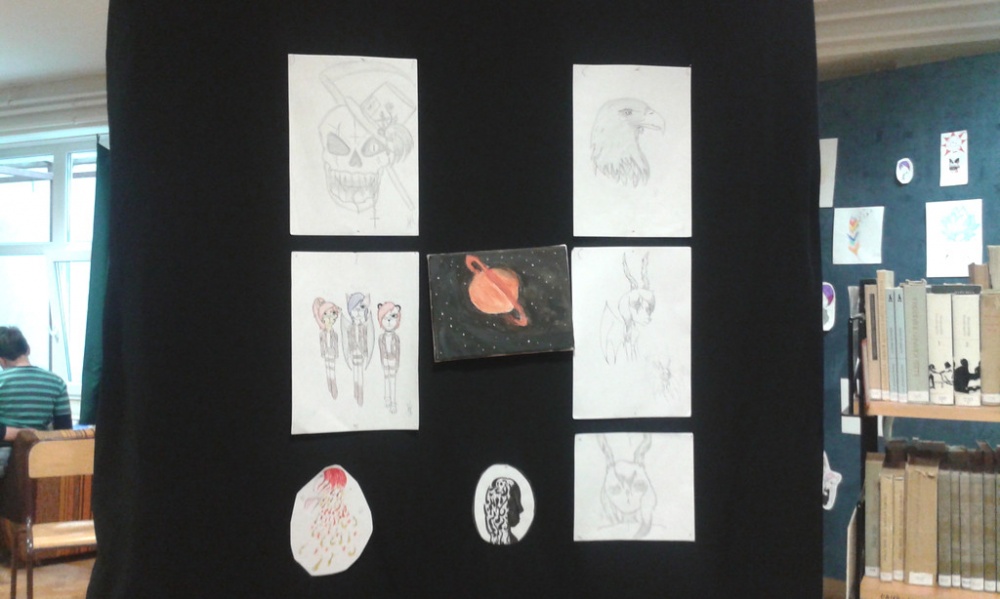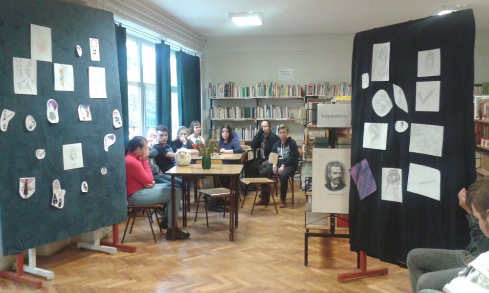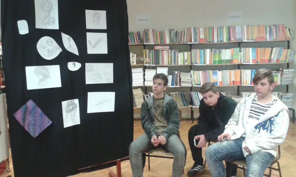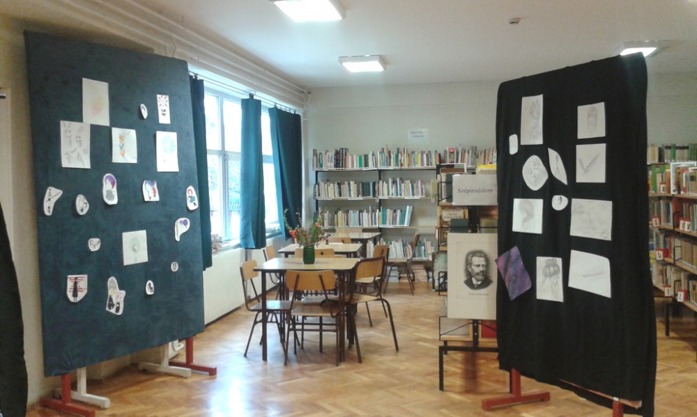 Minitárlat az iskolai könyvtárban Jakubik István képeiből.