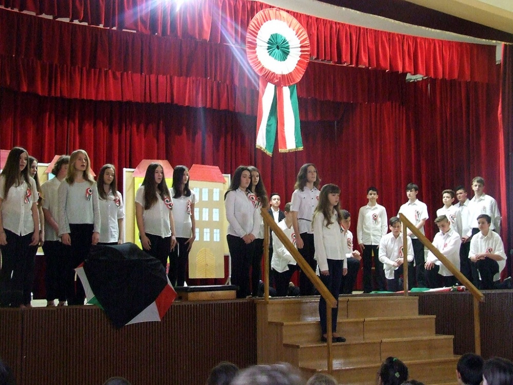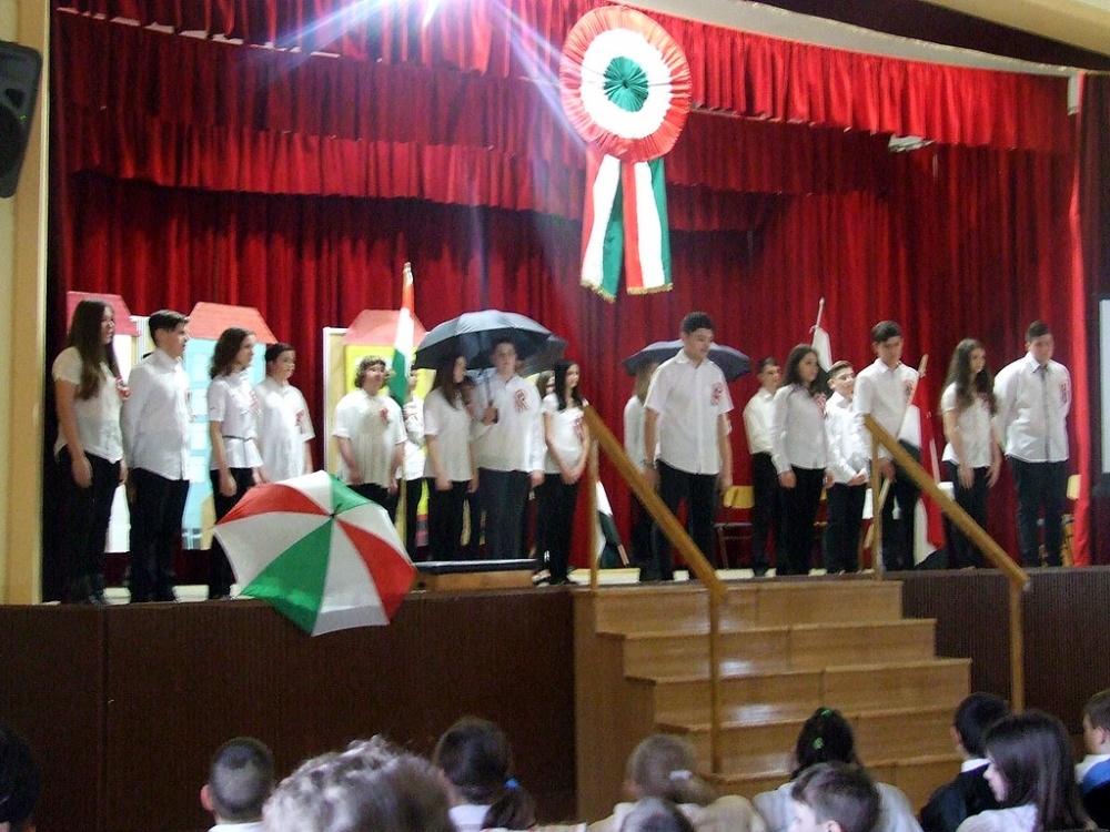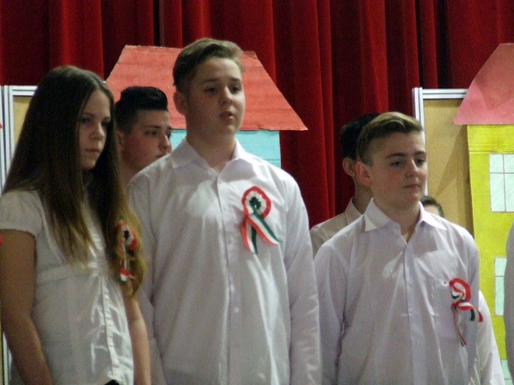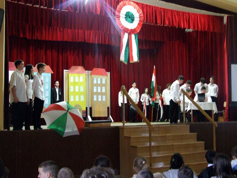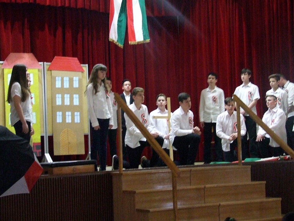 A március 15-i megemlékezésen a 7. a osztály állt színpadra. A hosszú hétvége miatt már 11-én lezajlott az iskolai ünnepség, ám az ünnepnapon is szerepeltek diákjaink a városi rendezvényen. Sok-sok gyakorlás, próbák hosszú sora előzte meg a szereplést - nem hiába! Tartalmas és látványos műsorral rukkoltak elő a hetedikesek, s a díszletet is maguk festették. A forgatókönyvet Pálházi Ilona tanárnő állította össze. A műsor betanításában a gyerekek segítségére volt Halcsikné Fejes Anetta osztályfőnök, a lebonyolításban pedig Árvai Tamás és Herczeg Irén tanárnő is közreműködött.