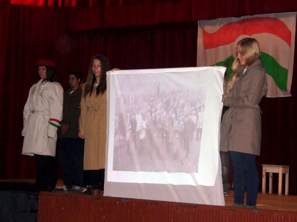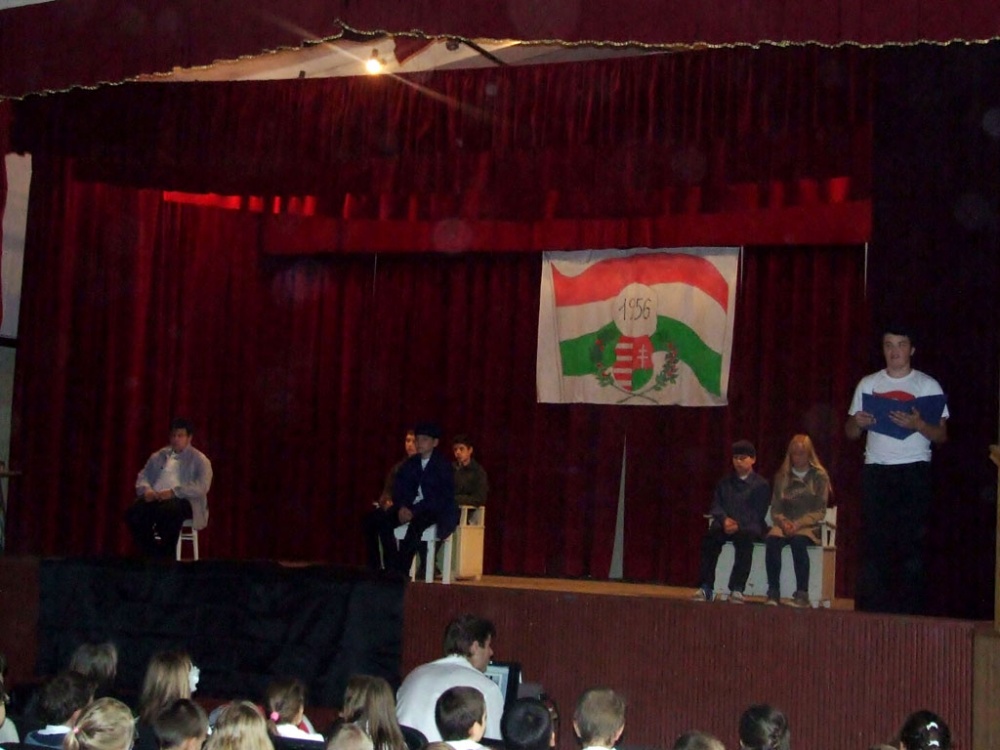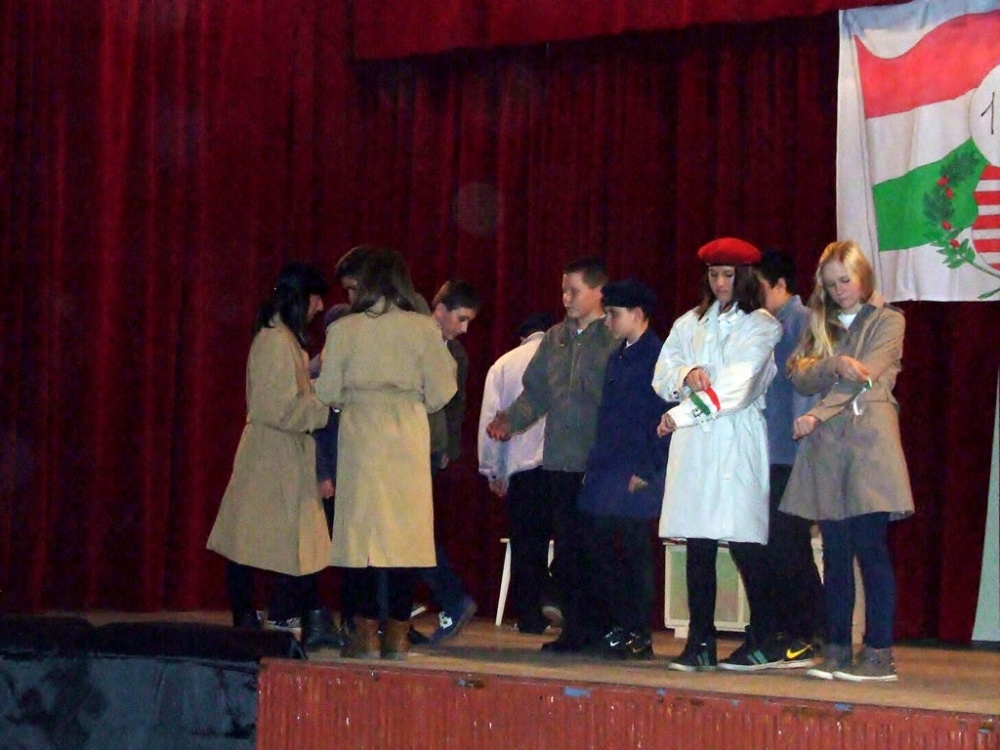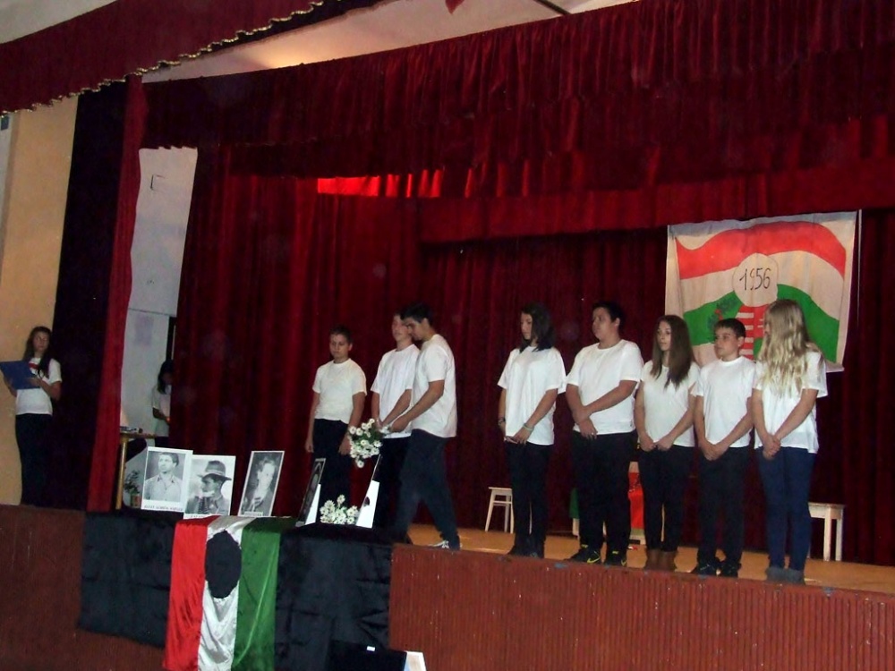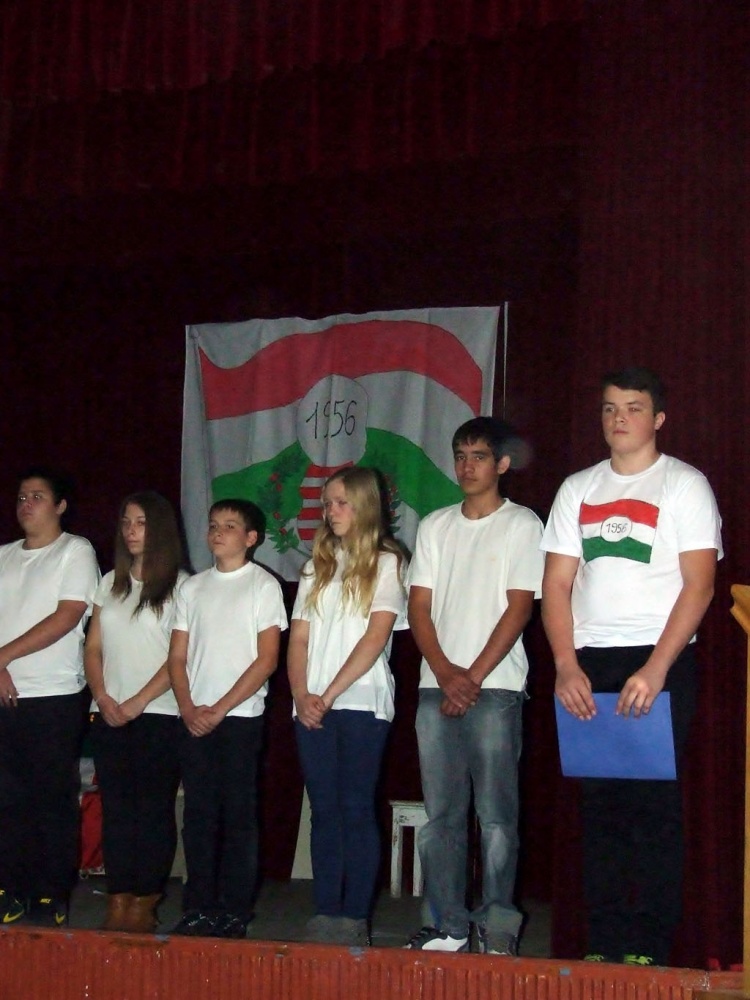 Az 1956-os forradalmi emlékműsor elkészítése ebben a tanévben a 8.a osztály feladata volt. A felkészülés során áttekintettük a történelmi eseményeket, összegyűjtöttük a forradalomról szóló dalokat, verseket. Megnéztük a Szabadság szerelem című filmet és elutaztunk Budapestre a Terror Háza Múzeumba. Az összegyűjtött információk alapján készült el a műsorunk.