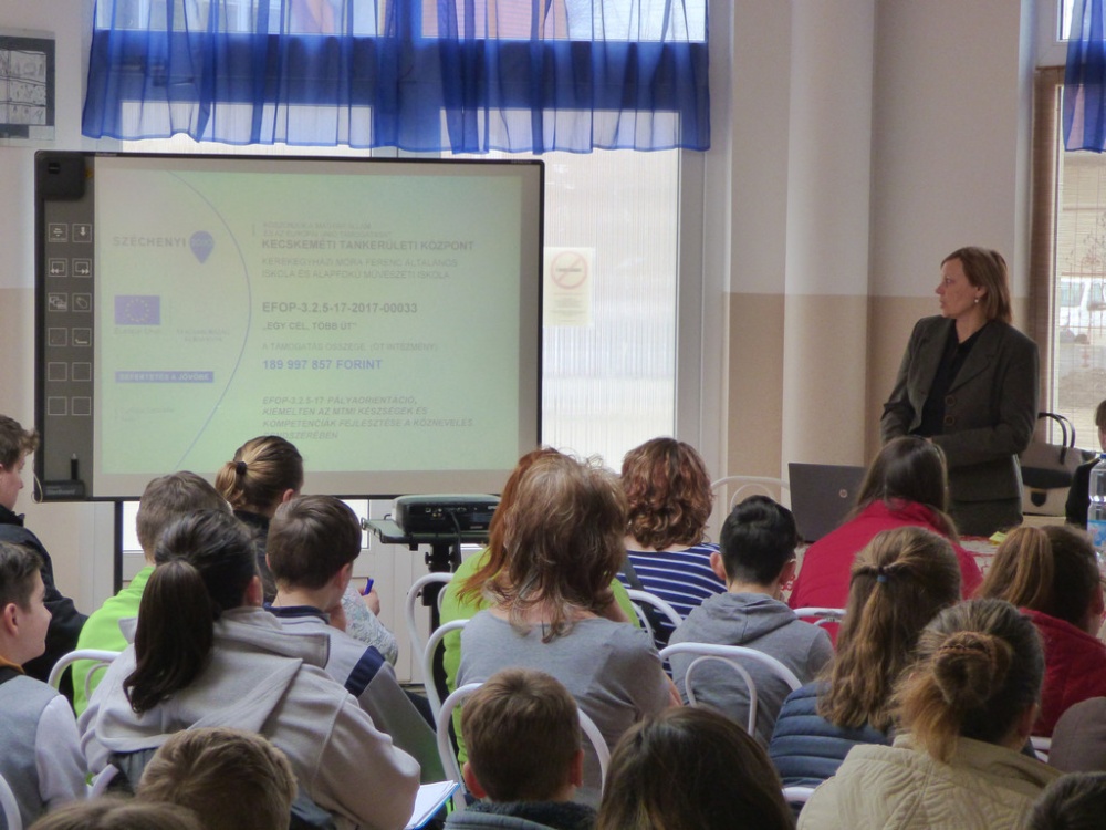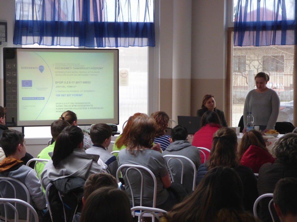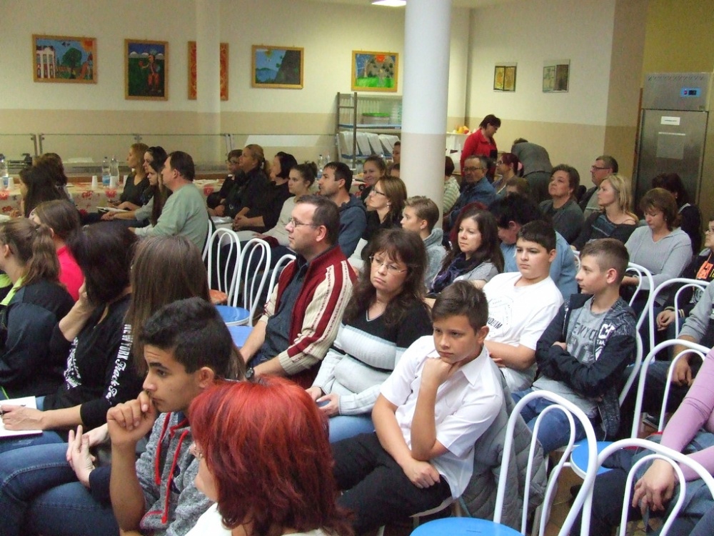 Hetedikes tanulóinknak és szüleiknek , pályaválasztási szülői értekezletet tartottunk. Az előzetes meghívók alapján nyolc középiskola képviseltette magát volt diákjaink által, valamint a Pályaválasztási Szakszolgálat szaktanácsadója . Gyurkovics Balázsné iskolánk igazgatója köszöntötte az egybegyűlteket és arról, szólt, hogy , milyen fontos tájékozottnak lenni a továbbtanulás terén, hogy a realitások és a tanulók álmai találkozzanak, valamint arról, hogy igaz még csak hetedik osztályosok de hamarosan szembesülnek a tovább tanulás aktuális feladataival. Huszka Klára a Pedagógiai Szakszolgálat képviseletében szintén köszöntötte az egybegyűlteket, egy- két általános jó tanácsot mondott és arról beszélt, hogy majd kiegészíti a diákok beszámolóit adott iskolájukkal kapcsolatban. Majd az iskolák diák képviselői (Kecskemét: Katona József Gimnázium, Piarista Gimnázium, Kada Elek Közgazdasági Szakgimnázium, Szent-Györgyi Albert Középiskola, Széchenyi István Idegenforgalmi, Vendéglátó ipari Szakgimnázium, Szakképző Iskola, Kandó Kálmán Szakközépiskola, Gáspár András Szakközépiskola, Szakképző Iskola) néhány percben bemutatták intézményüket, ismertették ,hogyan jutottak be , mennyit kell tanulni milyen szakköri szabadidős tevékenységek vannak az iskolájukban. A pályaválasztási szakreferens folyamatosan kiegészítette, új információkat fűzött a beszámolókhoz. Ezután kötetlen beszélgetés lehetősége volt a diákokkal és a pályaválasztási szaktanácsadóval, a szülők és tanulók személyesen fordulhattak kérdéseikkel a legilletékesebbekhez. Néhányan prospektusokat is osztogattak az induló képzésekről.