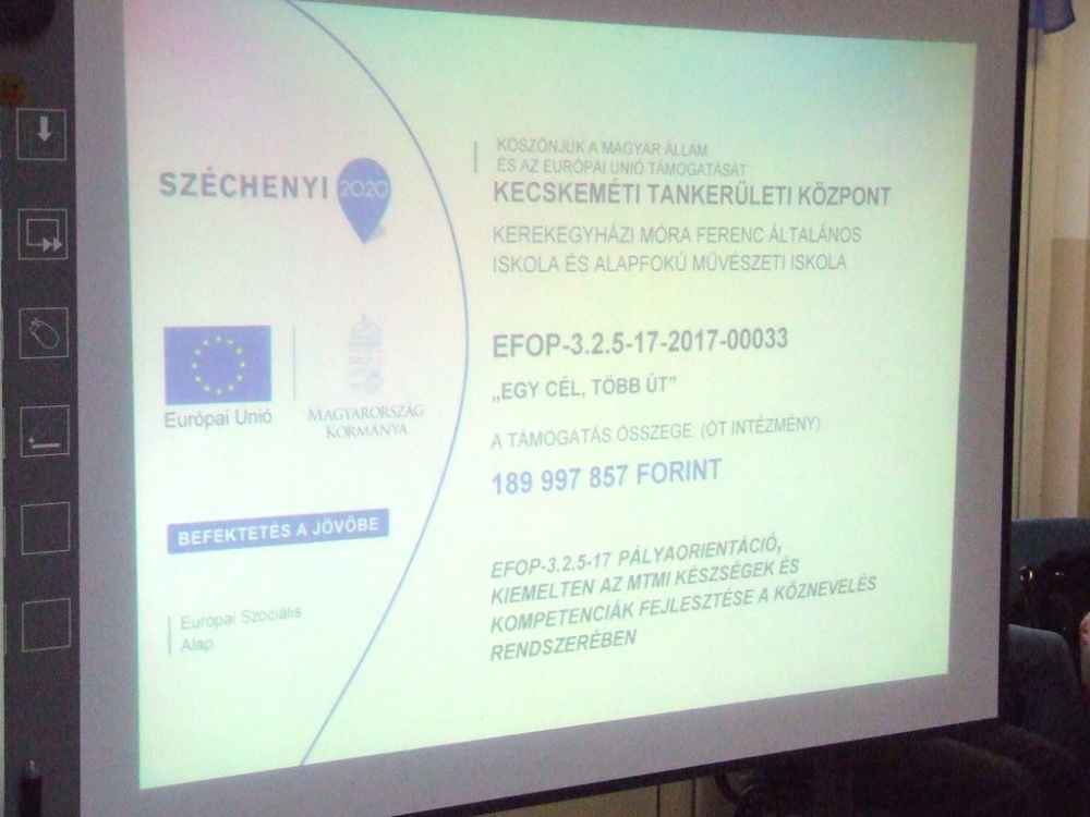 Iskolánkkal 2017. őszétől részt vettünk az EFOP-3.2.5-17-2017-00033 „Egy cél, több út!” című pályaorientációs pályázaton, amely keretében a 7. és 8. osztályos tanulók az informatikai, természettudományos szakirányokkal ismerkedhettek meg.