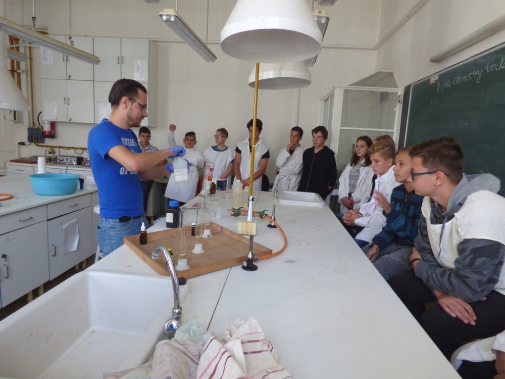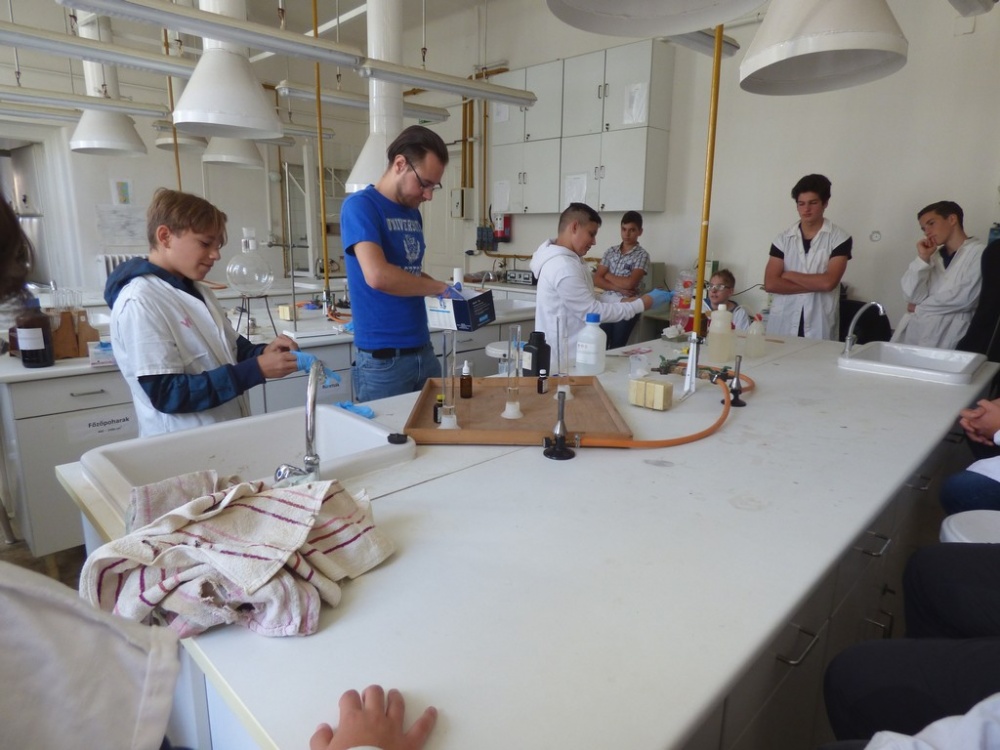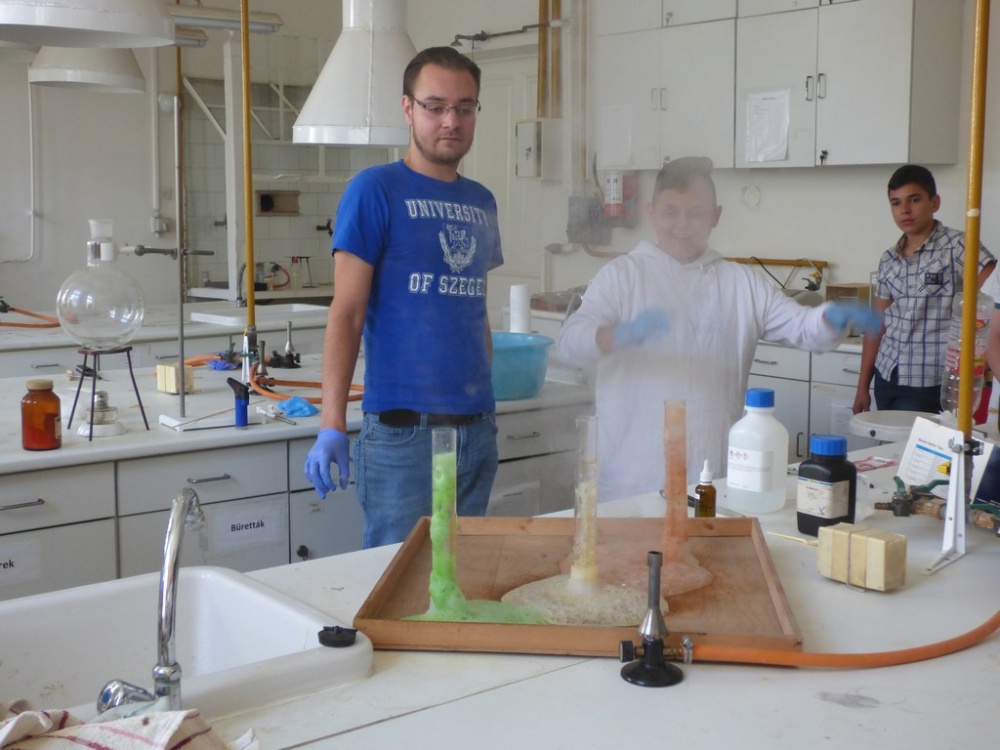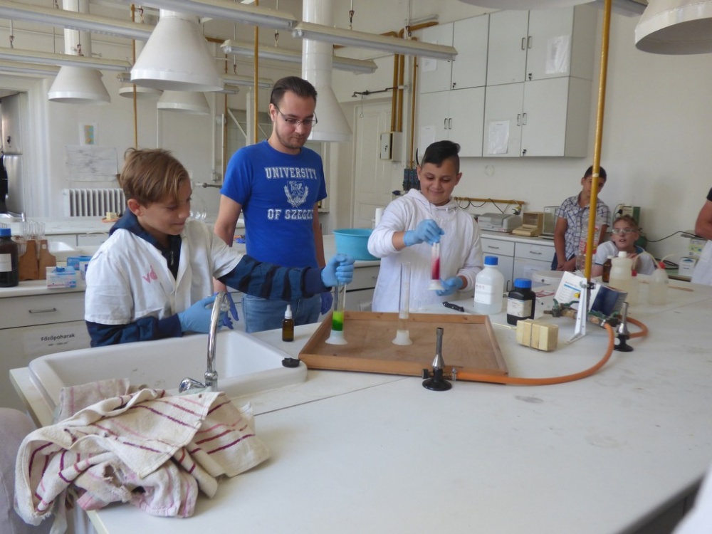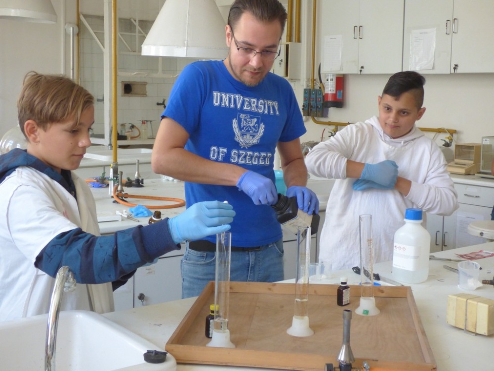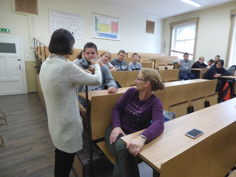 Délután a Juhász Gyula Főiskola tudástárában négy előadásból választhattak a tanulók. A lehetőségeik: Csillagászat, Fizikai kísérletek, Természeti pénzek, Kémiai kísérletek. Az egyes foglalkozásokon 20-20 tanuló vehetett részt, mindenki megtalálhatta a leginkább hozzá közelebb álló témakört. Az előadók nagy felkészültségről tettek tanubizonyságot és ügyeltek arra is, hogy az előadások során a lehetőségekhez mérten bevonják a diákokat a folyamatokba. Illetve a folyamatosan felmerülő kérdésekre mindig pontosan a megfelelő tanulói szinten válaszoltak. Az előadások után megtekinthettük a kiállítást is amely a kémia, csillagászat és biológia tantárgyakhoz kapcsolódó ismereteiket bővítette.