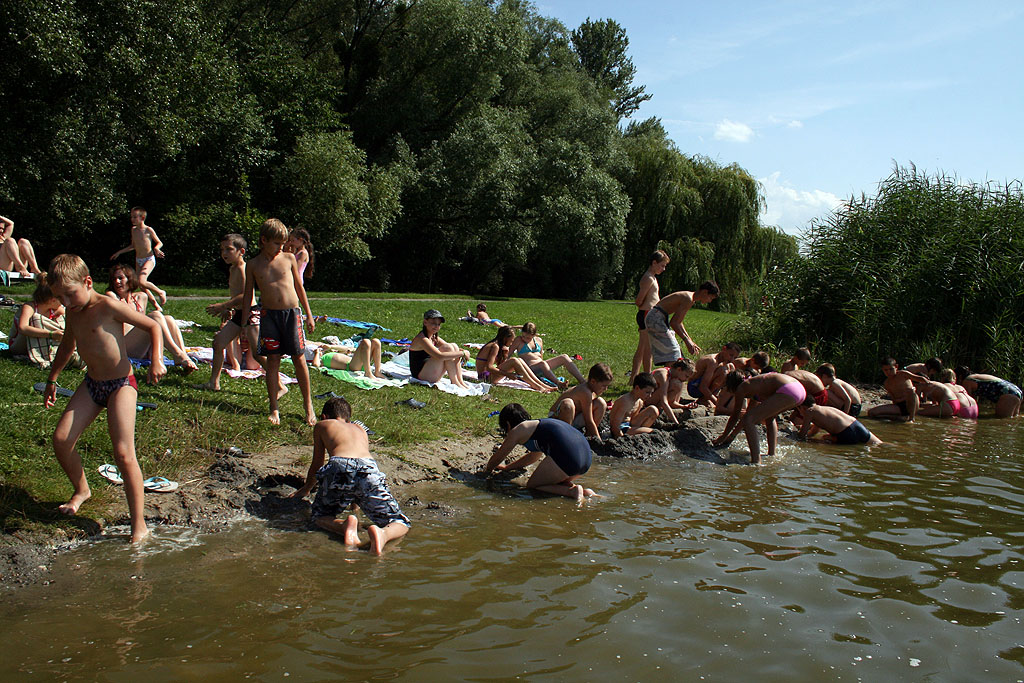 | 3. nap - szerda Délelőtt a felsősök forgószínpadszerűen dolgozták fel az adott témákat. Még ebéd előtt mindannyian városnéző kisvonattal megnéztük Tata nevezetességeit: Kálvária-domb, Szabadtéri Geológiai Múzeum, Kilátó, Tatai vár, Keresztelő Szent János szobra, várárok, Angolpark, Műrom. Délután fakultatív programok közül lehetett választani: fürdés az Öreg-tóban, salsa és zumba tanulása és sport. Dagonyáztunk a tóparton. Képek |